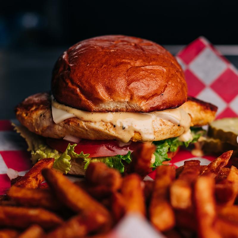 Grilled Honey-drizzled chicken sandwich topped with lettuce, tomato, onion, American cheese, and TMU house sauce.