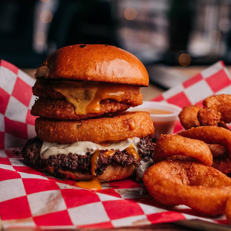 Double smash burger topped with American cheese, TMU house sauce, BBQ sauce, and an onion ring.