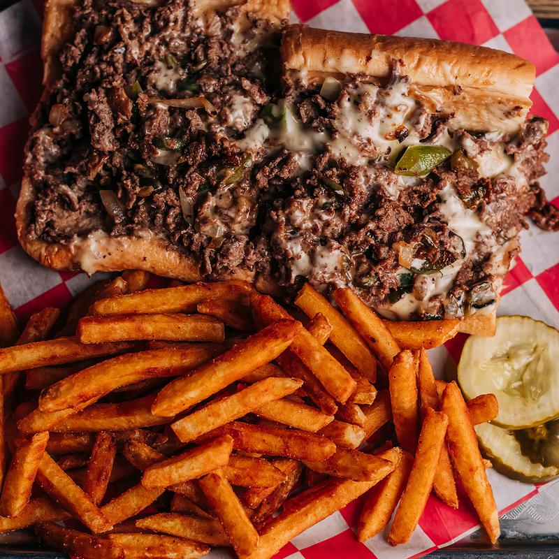 Classic Philly cheesesteak topped with onion, peppers, and American cheese.