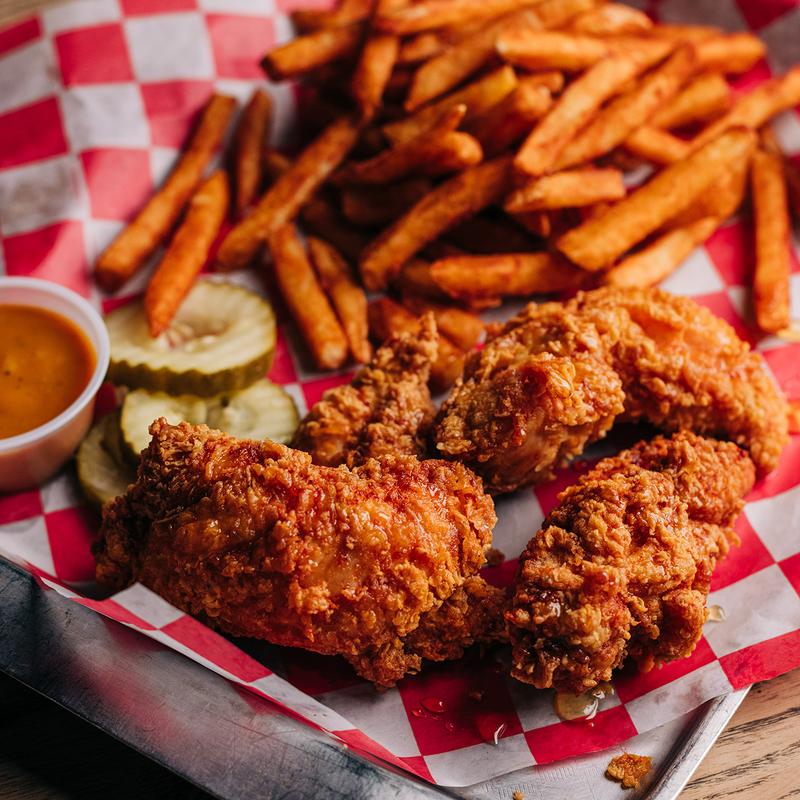 Spicy honey-drizzled chicken sandwich topped with lettuce, tomato, onion, American cheese, and TMU house sauce.