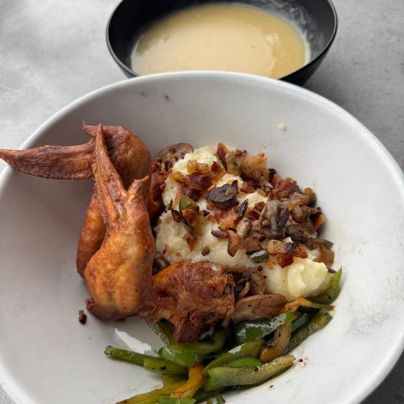 Our new mashed potato bowls are the ultimate comfort food, bringing that warm, homestyle feeling. Chicken wings, topped with sautéed bell peppers, onions, mushrooms, crispy bacon bits and our homemade gravy.