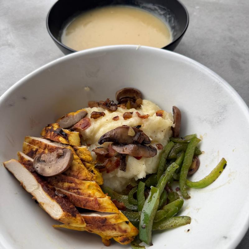 Our new mashed potato bowls are the ultimate comfort food, bringing that warm, homestyle feeling. Grilled chicken, topped with sautéed bell peppers, onions, mushrooms, crispy bacon bits and our homemade gravy.