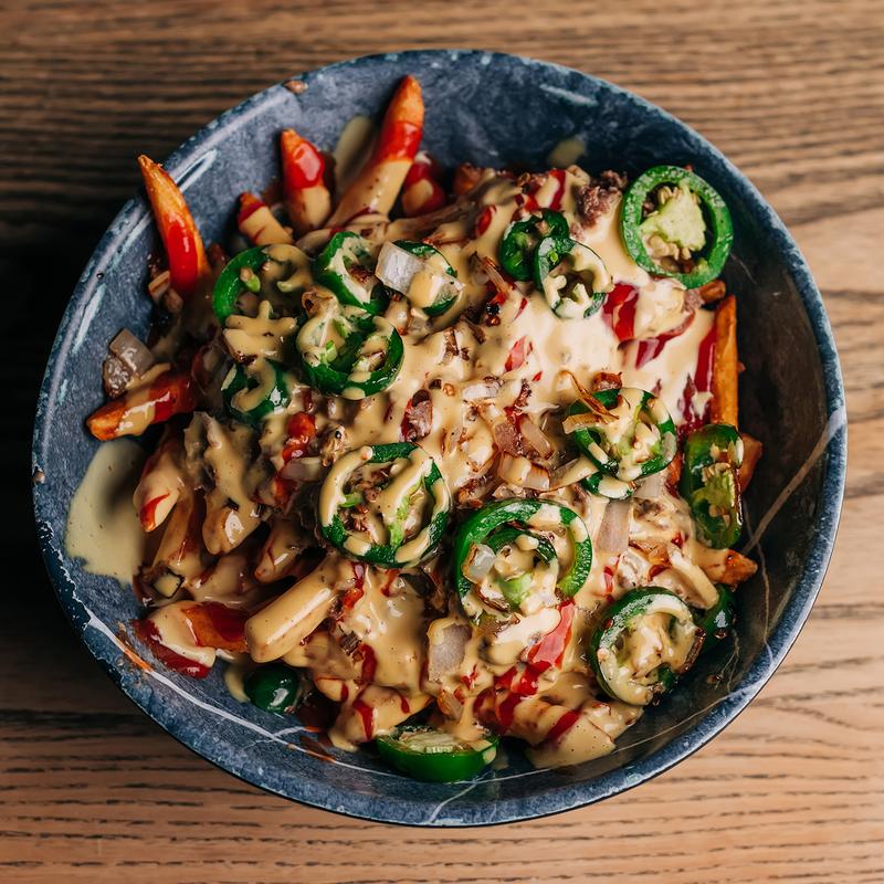 Bed of fries topped with Philly cheesesteak meat topped with jalapeños, grilled onions, spicy ketchup, and house sauce.