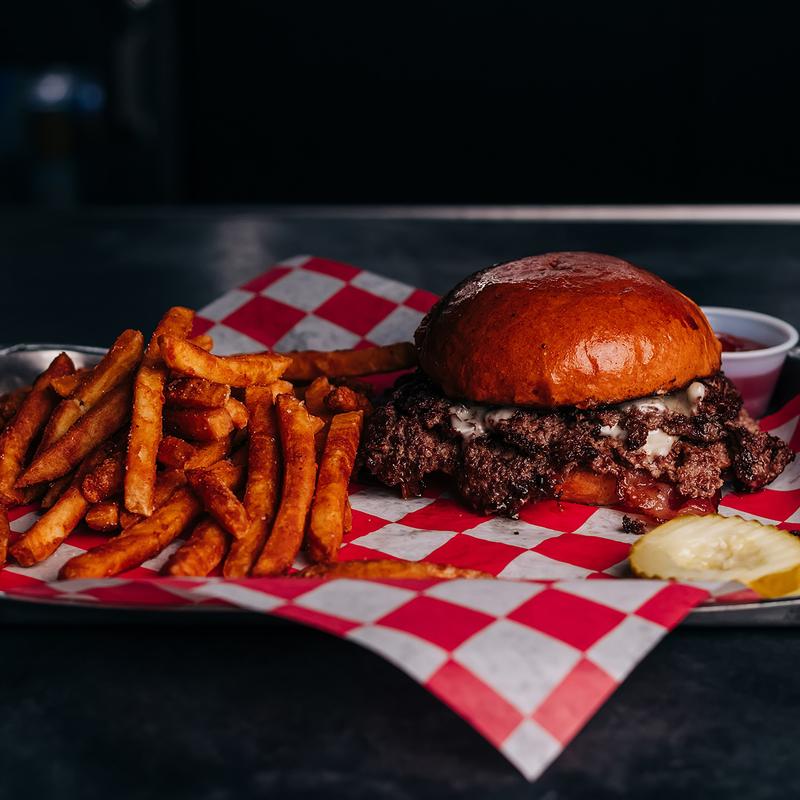 Double-smash burger topped with lettuce, tomato, onion, American cheese, and TMU house sauce.