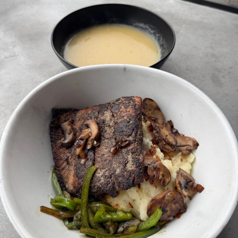 Our new mashed potato bowls are the ultimate comfort food, bringing that warm, homestyle feeling. Salmon, topped with sautéed bell peppers, onions, mushrooms, crispy bacon bits and our homemade gravy.